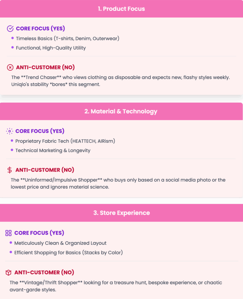 Uniqlo’s product strategy & collections emphasize timeless, high-quality basics, like simple t-shirts, quality denim, and functional outerwear. This deliberate simplicity repels the “Trend Chaser” negative persona.