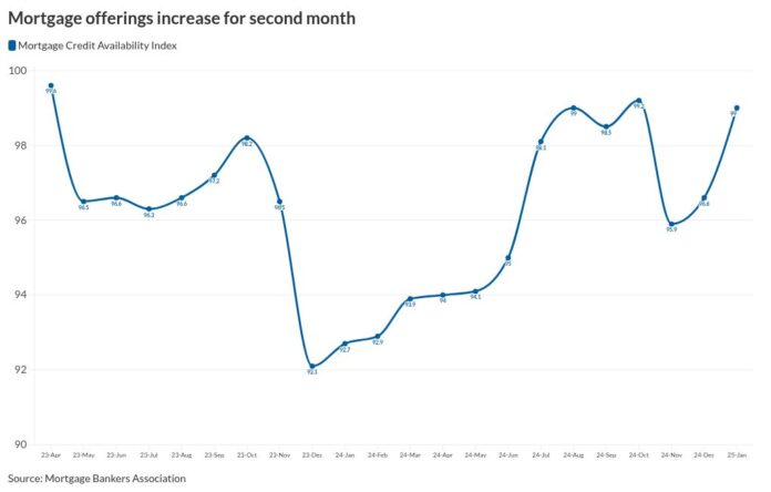 The number of home lending products on offer increased at the start of 2025, boosted by borrowers with strong credit, according to the latest report from the Mortgage Bankers Association.