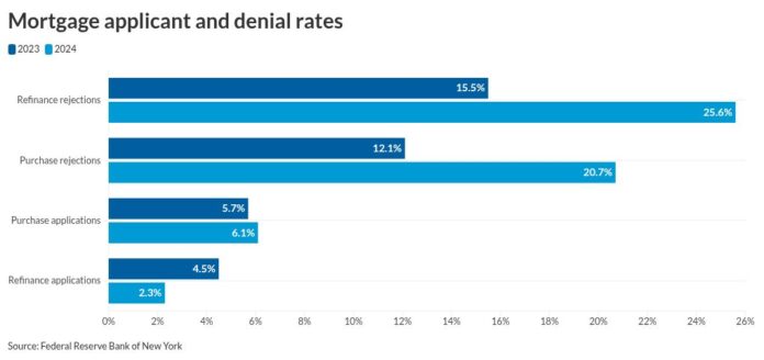 Mortgage application rejections surged in 2024, with refinance borrowers experiencing the highest rate of “no” in over 10 years, according to research by the Federal Reserve.