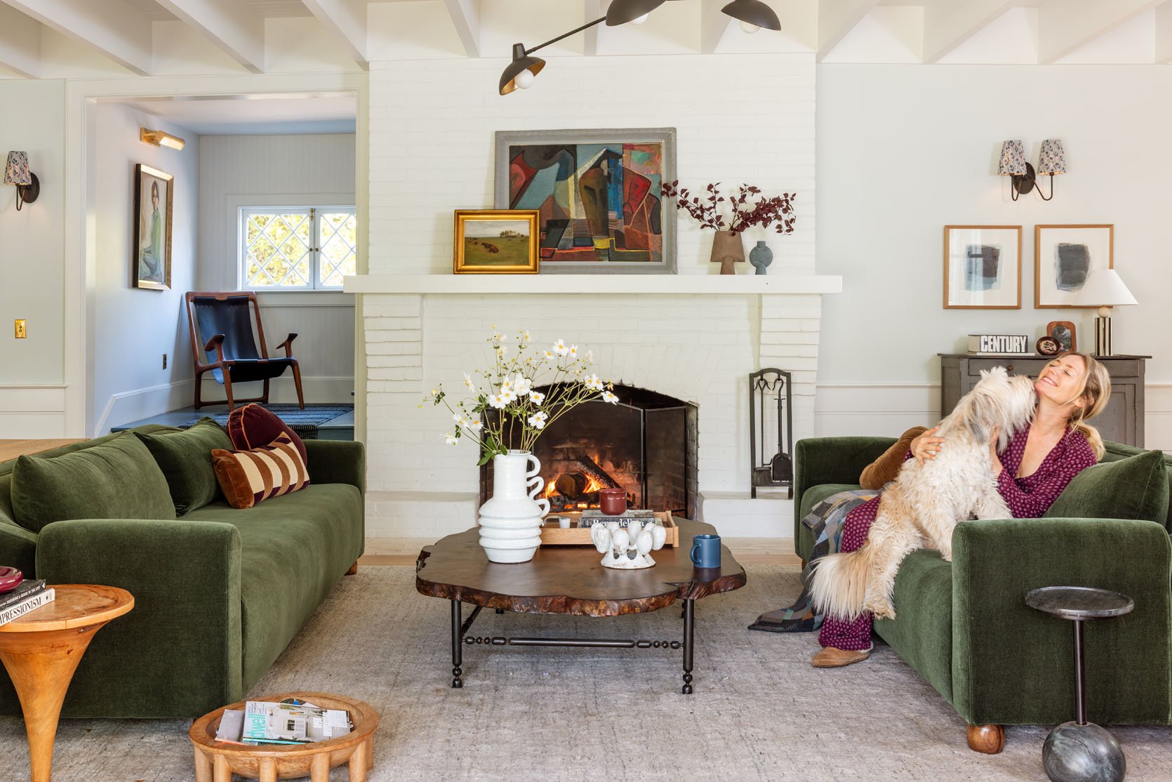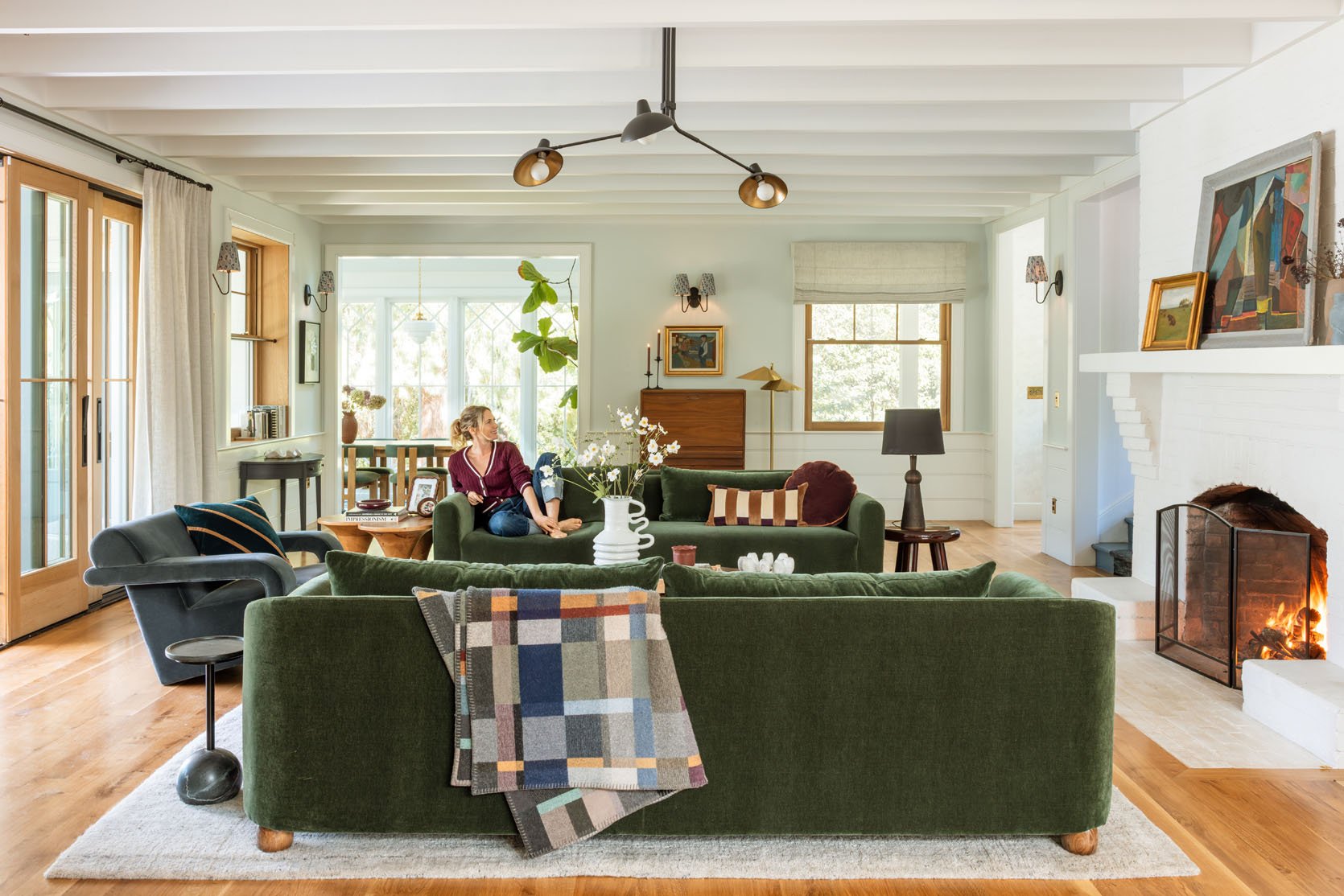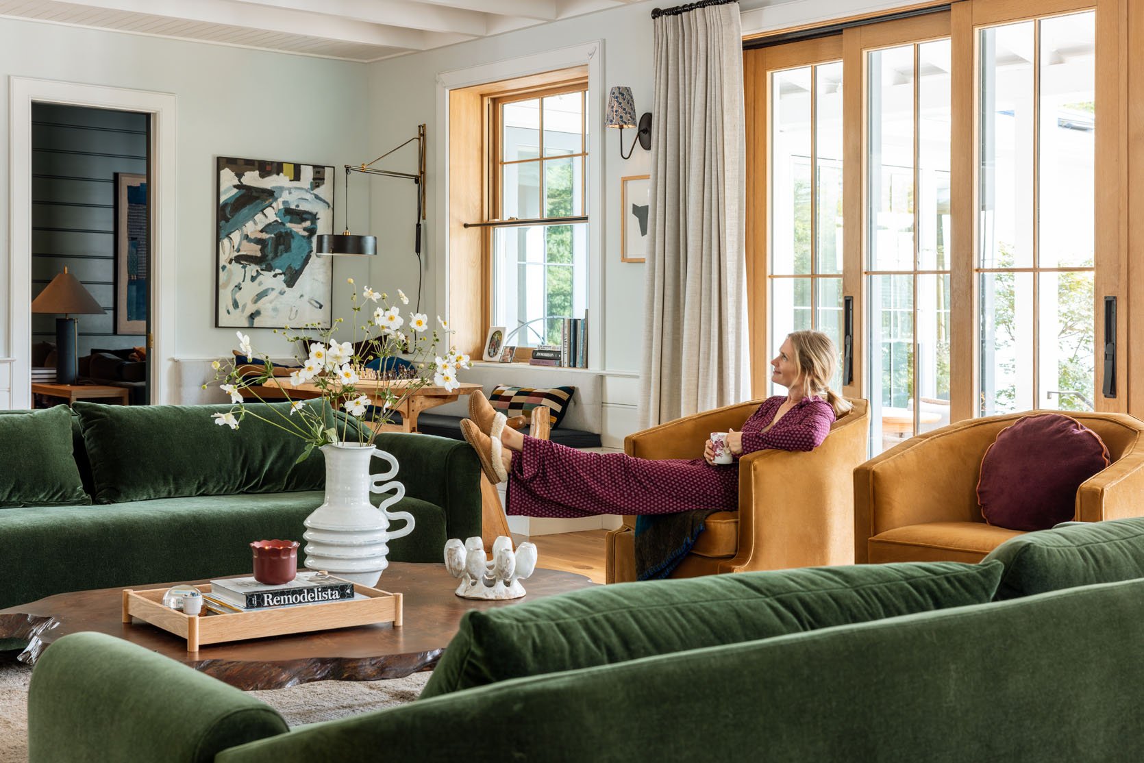 Going back and forth on the slider, it’s really just two very different vibes. The green feels richer, more high impact, more “design forward” in a way, but with that setup I felt that other things needed to change – the fireplace, the curtains, the wall color, and the rug. The balance of this intensity in the symmetrical sofas made the rest of the room feel unfinished (a lot of you had fantastic suggestions about mid-tones and more textiles, etc). But the second I got these two colors in here, in a non-symmetrical layout, the room gave a whole new good vibe. One that screamed invitation, and coziness, not to mention better scale and balance.