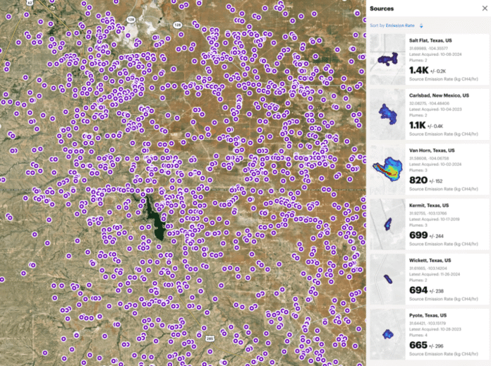 Satellite images show thousands of plumes of methane billowing from numerous types of infrastructure: wells, pipelines, compressor stations, and gas processing facilities.