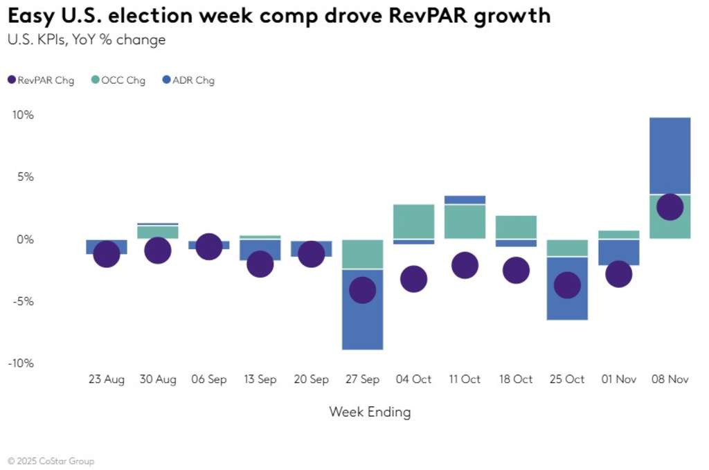 Against an easy comparable from last year’s presidential election week, U.S. revenue per available room (RevPAR) rose 6.2% for the period ending 8 November. The gain was fairly balanced with a 1.5 percentage point increase in occupancy and a 3.6% rise in average daily rate (ADR).