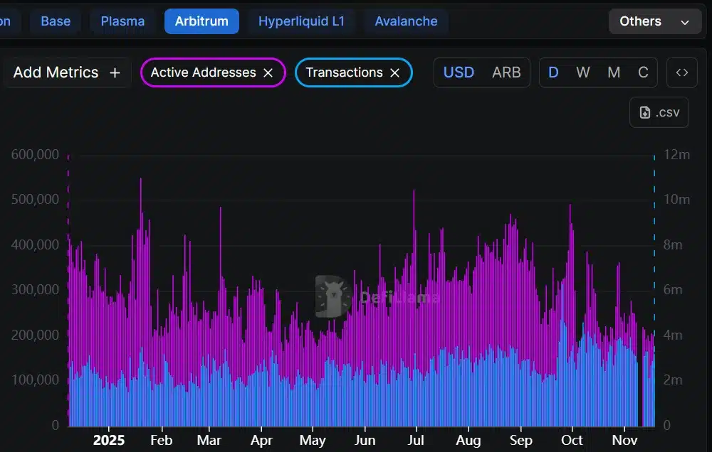 According to DefiLlama, Arbitrum boasts more than double the number of transactions — it has stabilized above 3 million, with rare drops to 2.9 million.