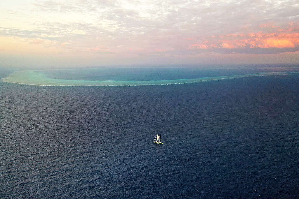 Greenpeace’s Rainbow Warrior ship sits near one of Woodside’s proposed drill sites at Scott Reef, Western Australia. The ship’s coordinates are near the closest proposed drill centre of Woodside’s Browse project to the reef.