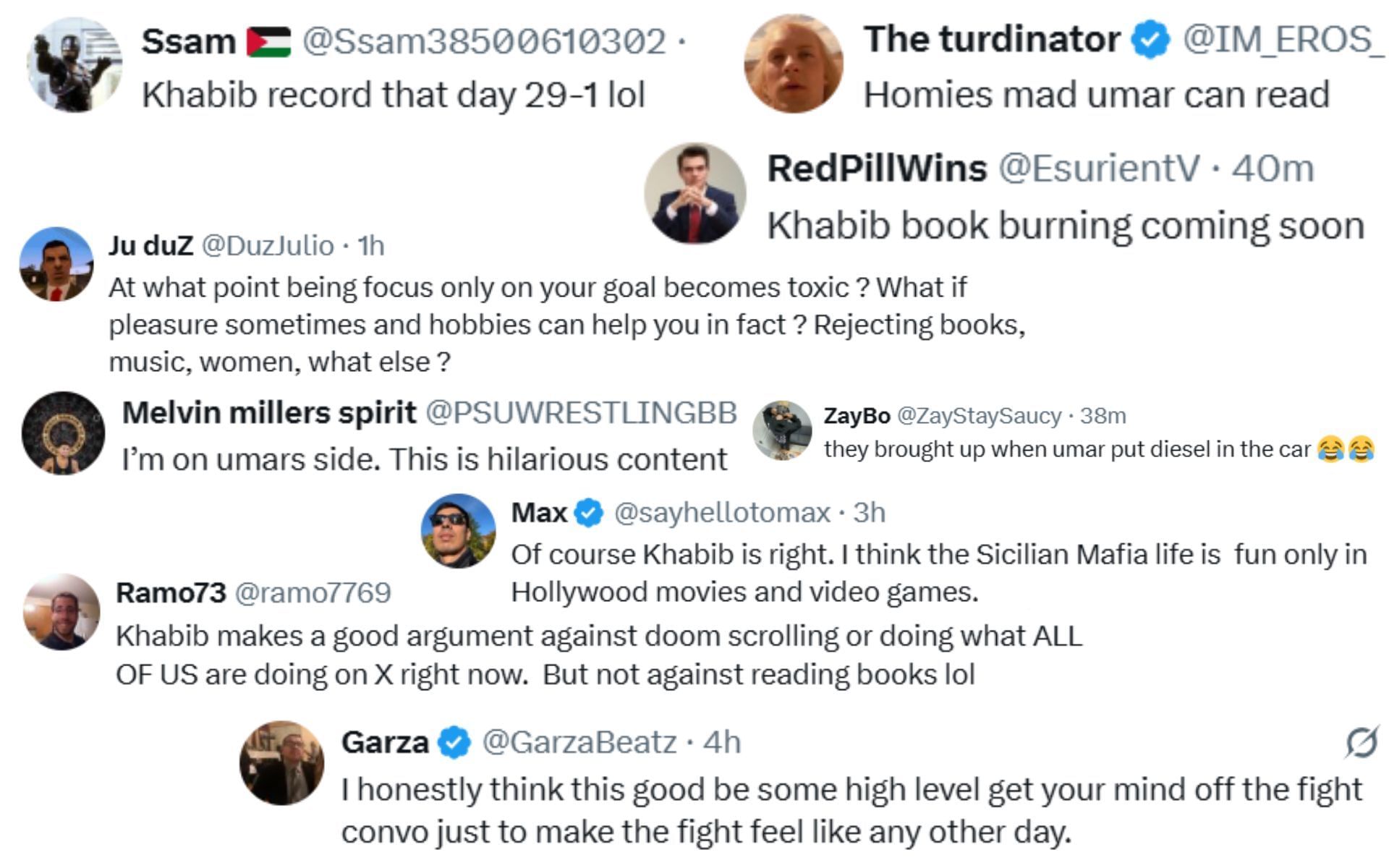 “Khabib makes a good argument against doom scrolling or doing what ALL OF US are doing on X right now. But not against reading books lol.”