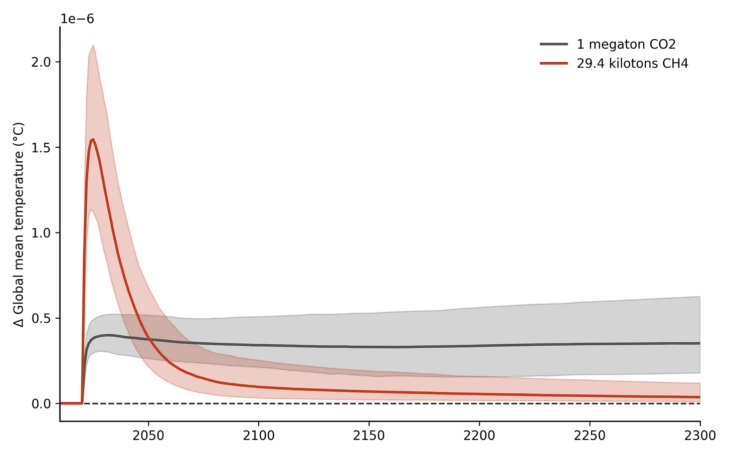 Global mean surface temperature warming associated with 1 megaton CO2 and a GWP100 equivalent amount of methane – 29.4 kilotons. Shaded areas represent the 5th to 95th percentile confidence interval of temperature response. Calculated using the FaIR climate model (calibrated constrained v1.4.1, with a 10-year CH4 lifetime). Note that the y-axis is in units multiplied by 10-6.