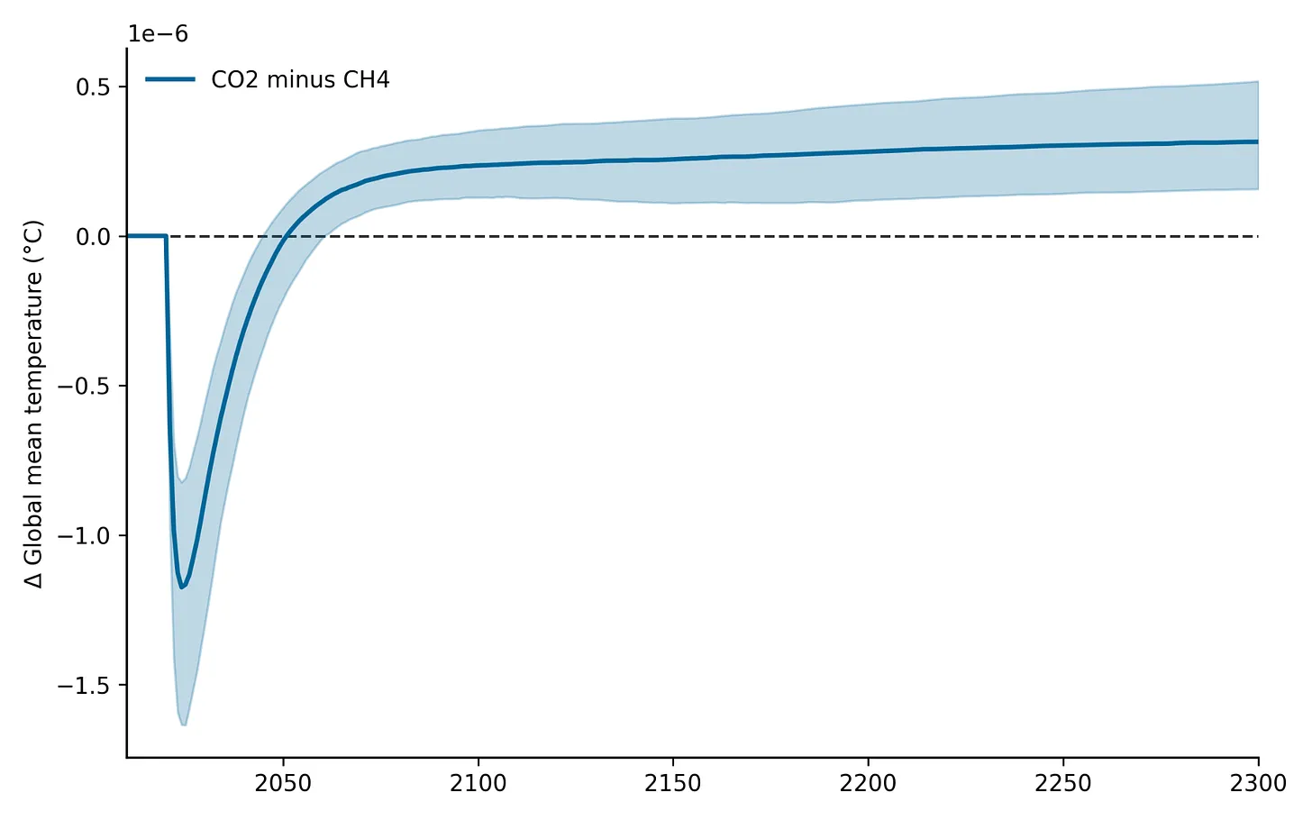 The math of GWP assumes that the red line and the grey line represent the same climate impact. It should be pretty obvious that they do not. If a company or country were to decide to offset a ton of CO2 emissions with a ton of methane abatement using a GWP100 approach, the actual temperature effect would be to trade short-term cooling of the climate for long-term warming, as shown in the figure below: