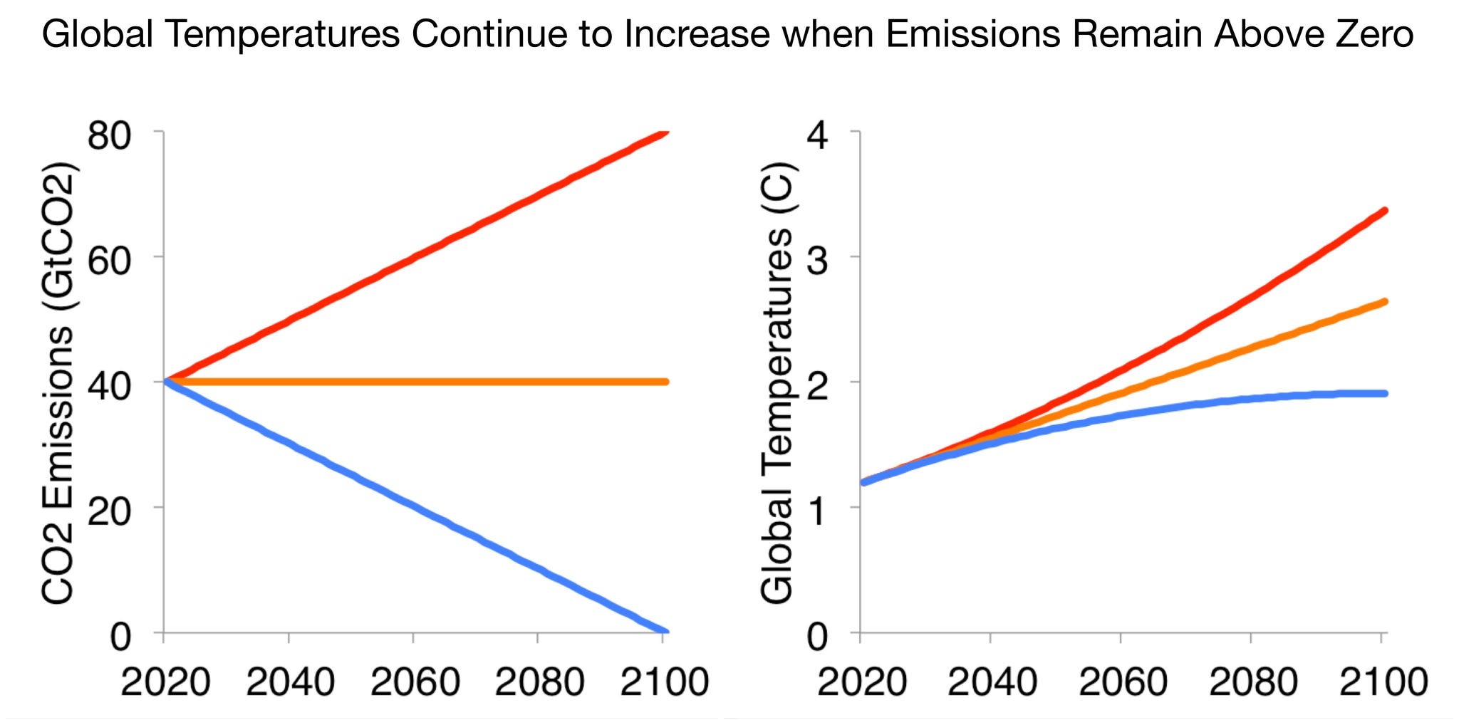 CO2 is an extremely stable molecule that accumulates in the atmosphere over time with constant emissions; while a portion of CO2 can be absorbed by land and ocean sinks in the form of organic or inorganic carbon, it does not naturally degrade. The warming that results from CO2 is – to a first order approximation – a largely time-invariant function of cumulative emissions. If CO2 emissions increase, the world warms faster; if they stay constant the world warms at a constant rate; if emissions decline, the world warms more slowly. But even if CO2 emissions get to zero, the world does not meaningfully cool back down for centuries to come; the only way to cool the planet through CO2 is to go net-negative – remove more CO2 from the atmosphere than we are adding.