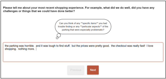 We have created an example survey that demonstrates both the open-ended prompting that we launched in the last blog post and the ability to interpret the verbatim text.  On the first page, you are asked to type in some thoughts about your recent shopping experience.  After a few seconds, you will see prompts based on the text you enter.  This will work in any language.