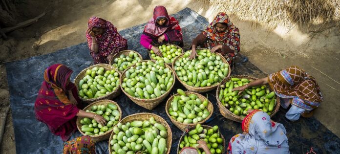 Female participants of a food security livelihood programme sort freshly collected eggplants in Cox’s Bazar in Bangladesh.