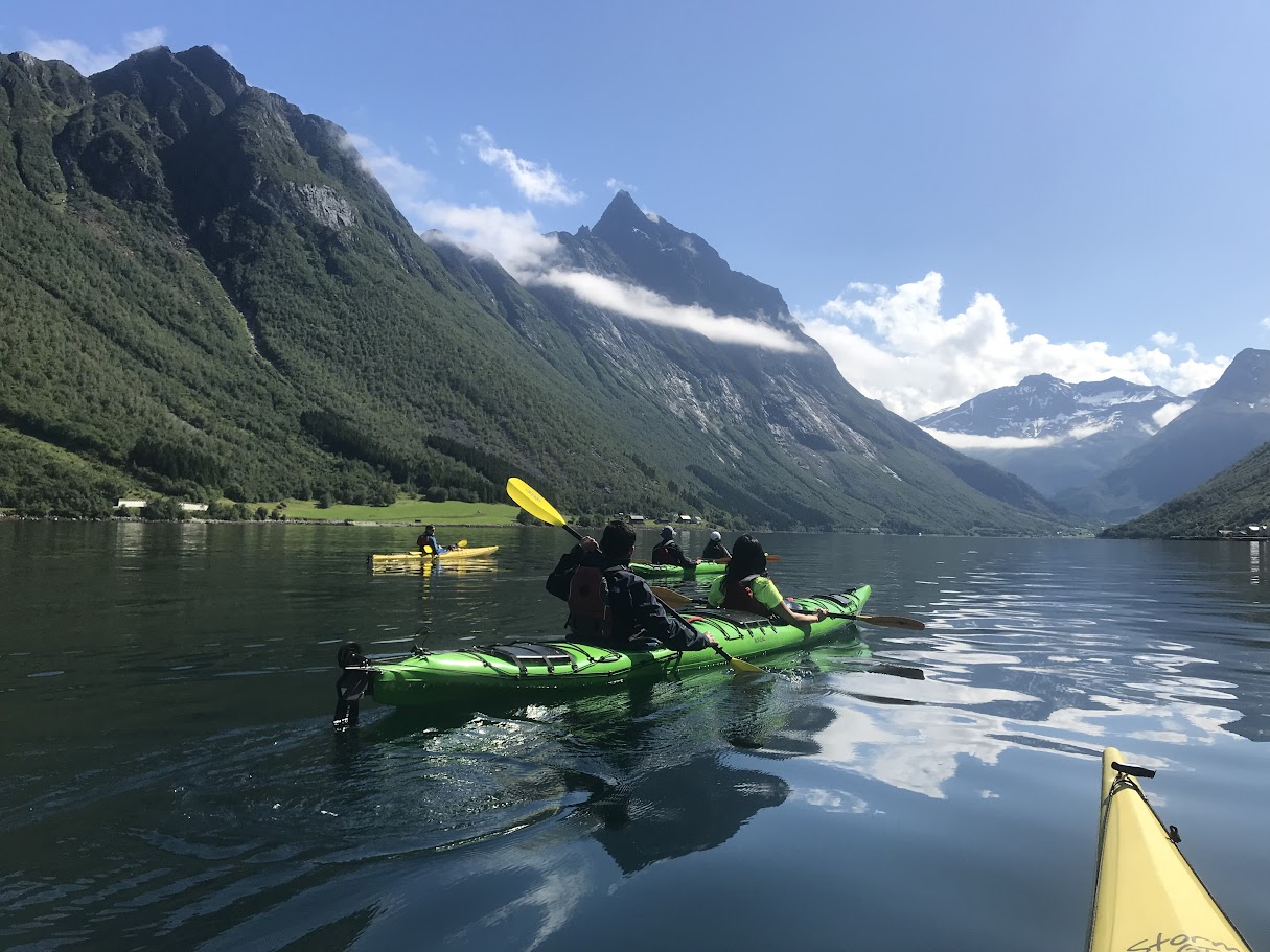 - KAYAK in a dramatic fjord across calm waters.