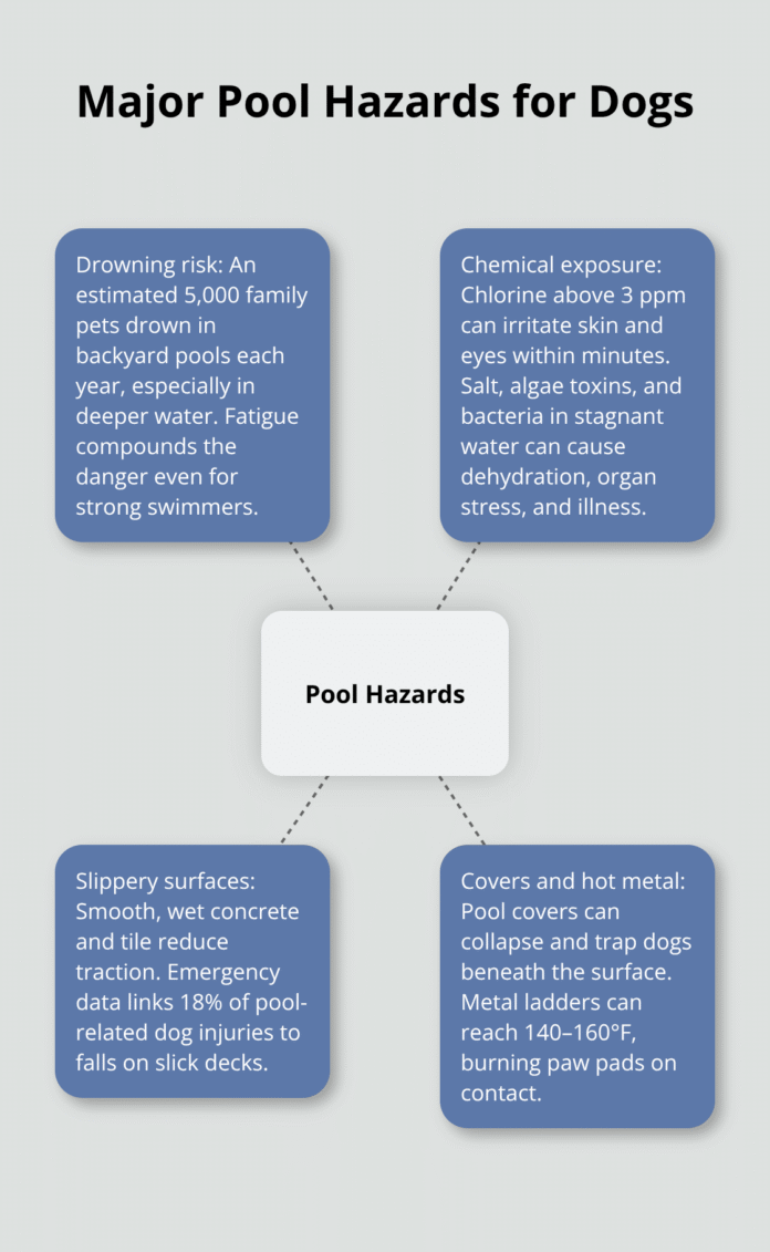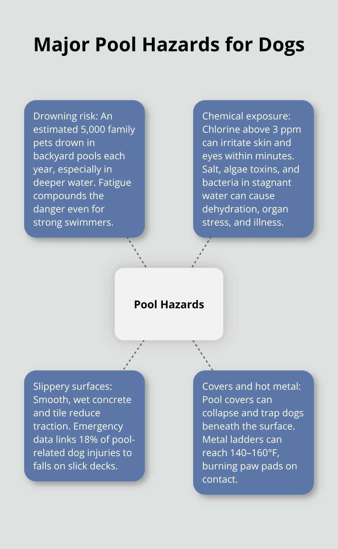 Dogs face three major pool hazards that kill or injure thousands of pets annually. An estimated 5,000 family pets drown in backyard swimming pools each year, with most accidents happening in deeper water where dogs struggle to find the bottom. Dogs tire faster than humans in water, which makes fatigue a deadly risk even for strong swimmers. Emergency data shows that 18% of pool-related dog injuries stem from falls on slippery surfaces around pools, where dogs cannot grip smooth concrete or tile when they run on wet decks.